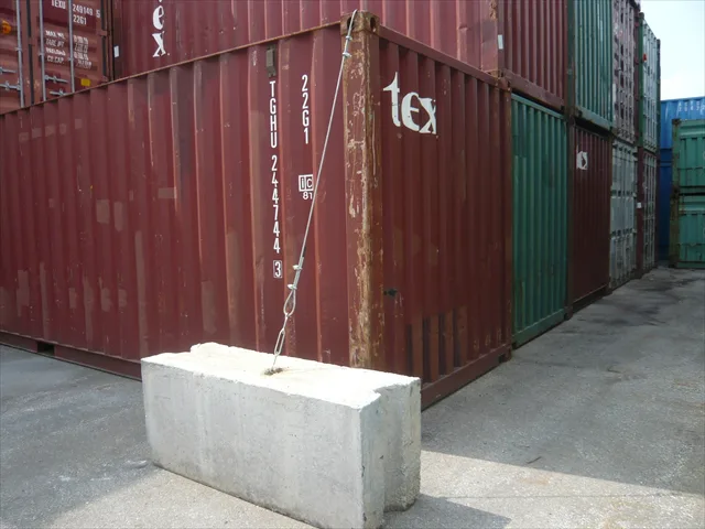 コンテナの台風対策として、コンテナと2個~4個のトンブロックをワイヤーで繋げてコンテナを固定します。 |