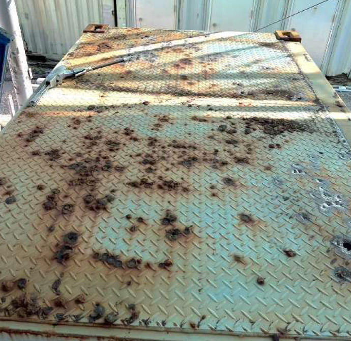 サビ打ち→サビ磨き→穴埋め鉄板溶接(厚み1.6mm 120cm×240cmサイズ)→サビ止め塗装→カラー塗装